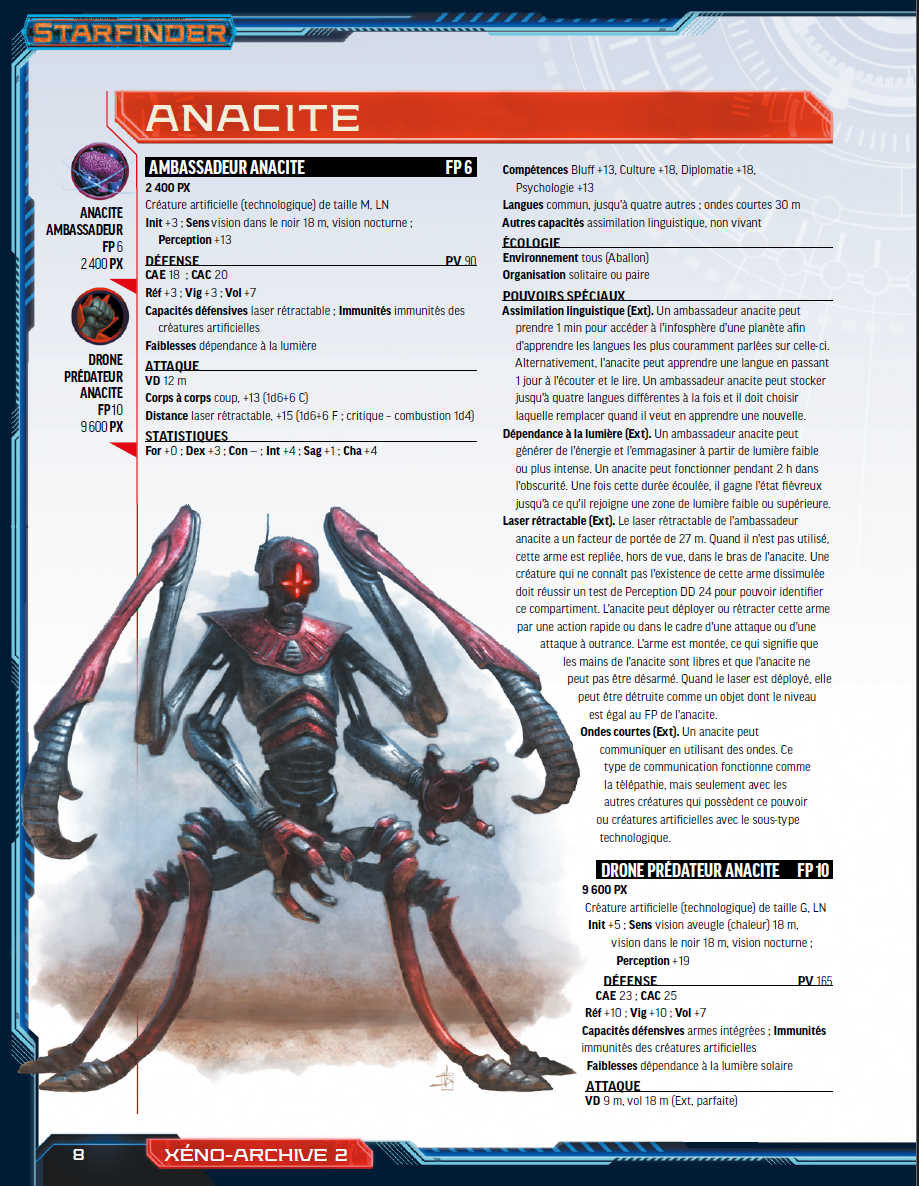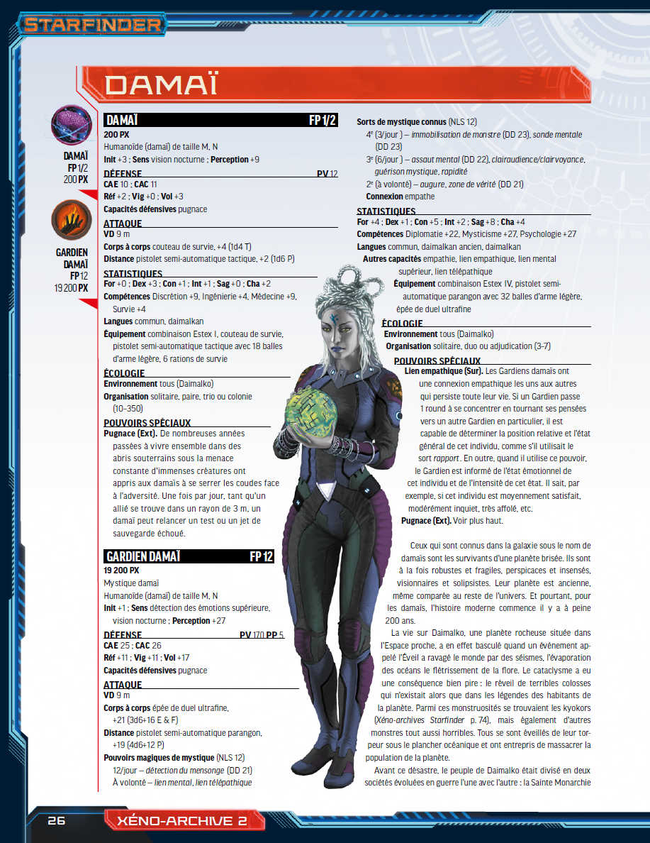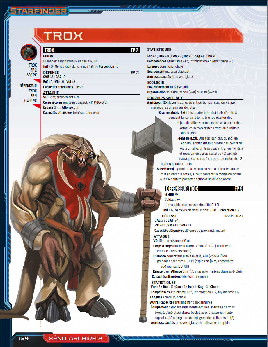Xéno-archives 2  vous propose une foule de nouvelles créatures conçues pour être utilisées avec le jeu de rôle Starfinder. Des tashtaris au souffle laser et protozoaires stellaires dévoreurs de vaisseaux aux mantas de la poussière en passant par les soldats osseux morts-vivants, les créatures de ce codex mettront au défi les aventuriers, quels que soient les mondes étranges qu’ils décideront d’explorer. De plus, quantité de créatures bénéficient de règles qui permettront non seulement aux joueurs de les combattre mais aussi de les incarner !